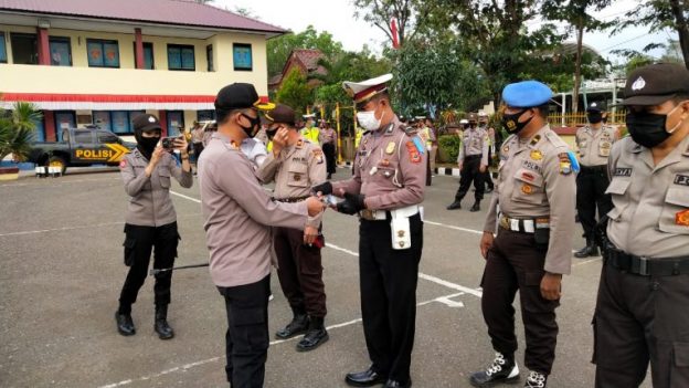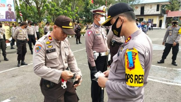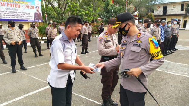 Kapolres menyampaikan bahwa pembagian masker berlogo TNI-Polri ini, adalah sebagai bagian dari protokol kesehatan pencegahan Covid-19 bagi anggota Polri dalam melaksanakan tugas operasional Kepolisian.