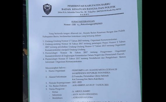 BARRU, RRN – Aliansi Media Jurnalis Independen Republik Indonesia (AMJI-RI) Kabupaten Barru, Provinsi Sulawesi Selatan (Sulsel) menerima Surat Keterangan Terdaftar (SKT) dari Badan Kesatuan Bangsa dan Politik (Kesbangpol) Barru.