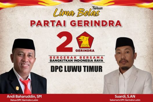 Lanjut Ketua DPC Partai Gerindra Kabupaten Luwu Timur Andi Baharuddin, SM di dampingi Sekertaris DPC Suardi, S.AN, mengatakan bahwa Hari Ulang Tahun Partai Gerindra yang di gelar hari ini serentak di seluruh Indonesia termasuk di Kabupaten Luwu timur yang dilaksanakan secara sederhana di Sekretariat DPC Partai Gerindra di Kota Malili.