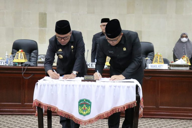 Usai menyampaikan sambutan, Bupati bersama Ketua DPRD Lutim, Aripin melakukan penandatanganan Persetujuan Bersama Kepala Daerah dan DPRD terkait Ranperda tentang Badan Permusyawaratan Desa (BPD) dan sekaligus menyerahkan Ranperda tentang Pertanggungjawaban Pelaksanaan APBD TA. 2021 kepada Ketua DPRD.