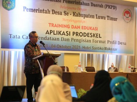 Pelaksanaan Bimtek Training Dan Edukasi Aplikasi Prodeskel tata cara pendataan dan pengisian format profil desa bagi Perangkat Desa se-Kab. Luwu Timur yang diselenggarakan di Hotel Santika Makassar tersebut dibuka oleh Bupati Luwu Timur, H. Budiman yang dihadiri Kasubid Evakuasi Perkembangan Desa Wilayah 3 Kalimantan dan Sulawesi, Dr. Wawan Munawar Kholik, M.Si dan Kadis PMD Luwu Timur, Halsen serta para Peserta.