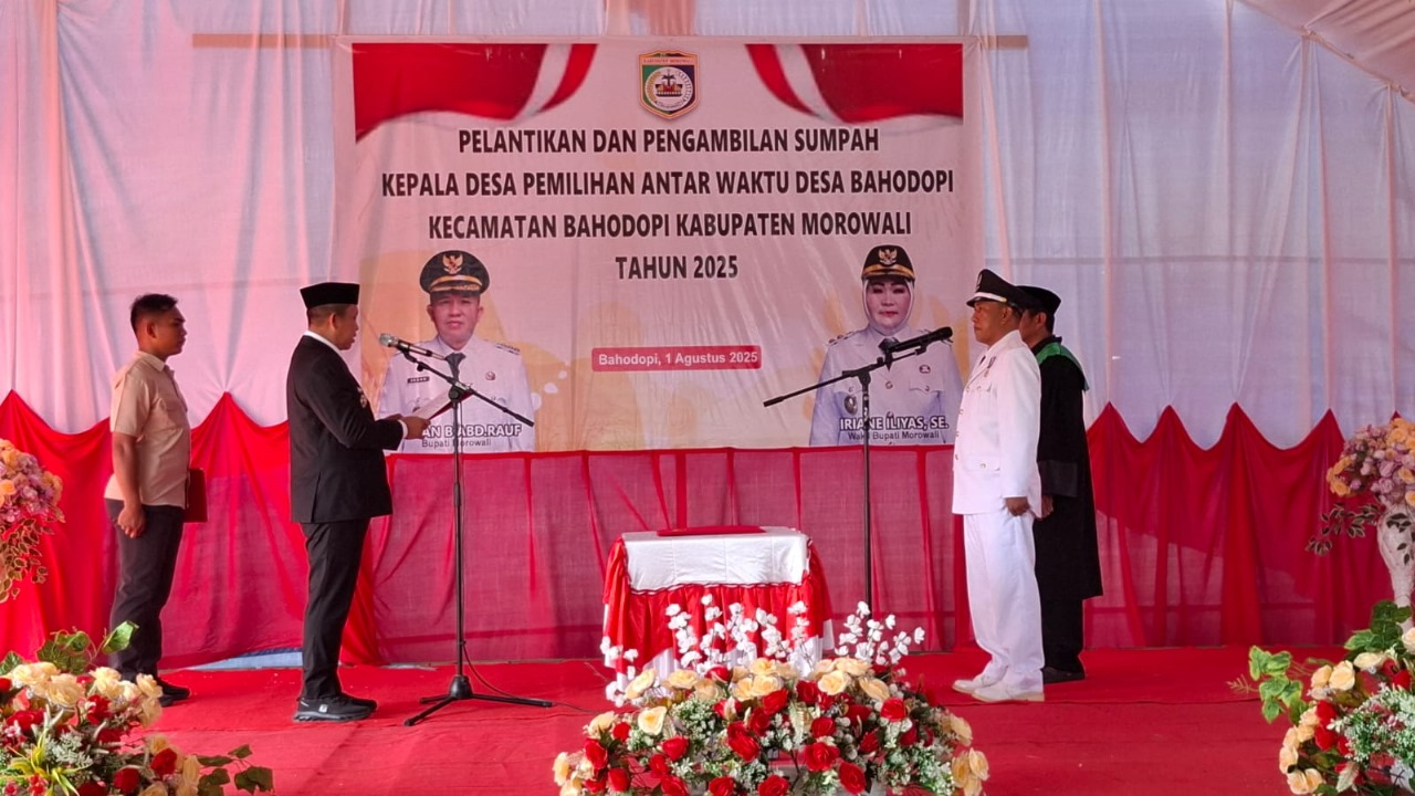 MOROWALI, RRN – Bupati Morowali, Iksan Baharudin Abdul Rauf, melantik Kepala Desa Pemilihan Antar Waktu (PAW) Desa Bahodopi, Kecamatan Bahodopi, Jumat (1/8/2025).