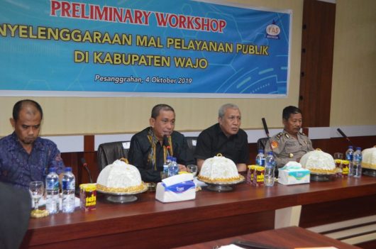 WAJO, RRN—Pre Liminary Workshop penyelenggaraan Mal pelayanan publik di Kabupaten Wajo oleh Dinas Penanaman Modal dan Pelayanan Terpadu Satu Pintu kerja sama dengan Yayasan Adil Sejahtera Provinsi Sulawesi Selatan yang diselenggarakan di ruang rapat pimpinan Kantor Bupati Wajo, Jumat 4 Oktober 2019.