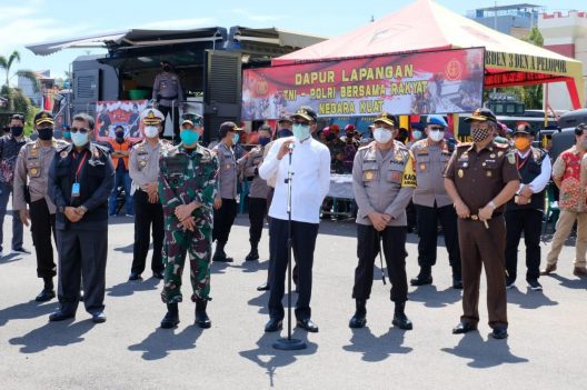SULSEL, RRN—Gubernur Sulsel, Ir.H.Nurdin Abdullah, Pangdam XIV /Hasanuddin Mayjen TNI Andi Sumangerukka, Kapolda Sulsel Irjen Pol Drs. Mas Guntur Laupe dan unsur Forkopimda lainnya memantau fasilitas dapur lapangan yang disiapkan oleh Satuan Brimob Polda Sulsel di markasnya jalan KS Tubun Makassar, Jumat (17/4/2020).