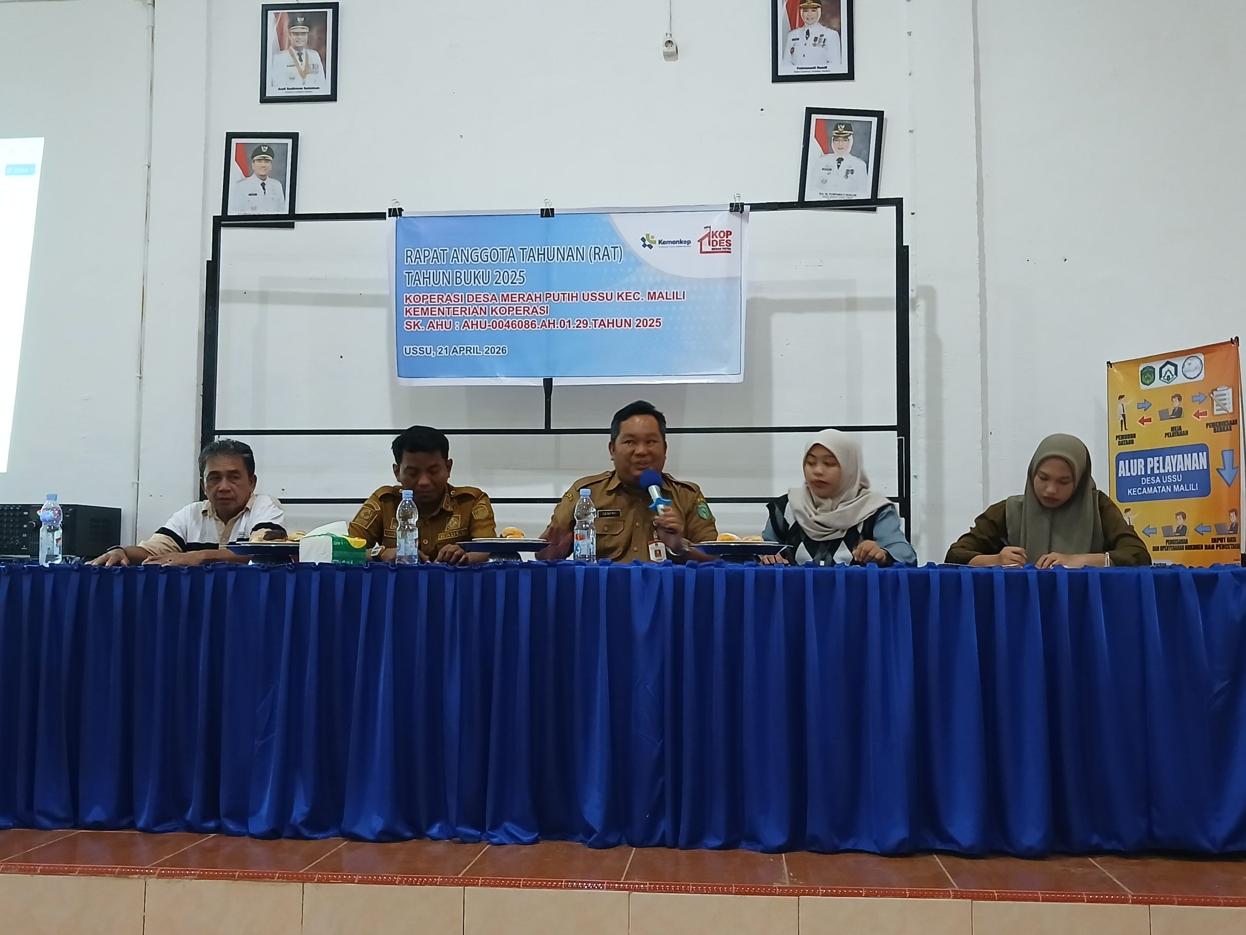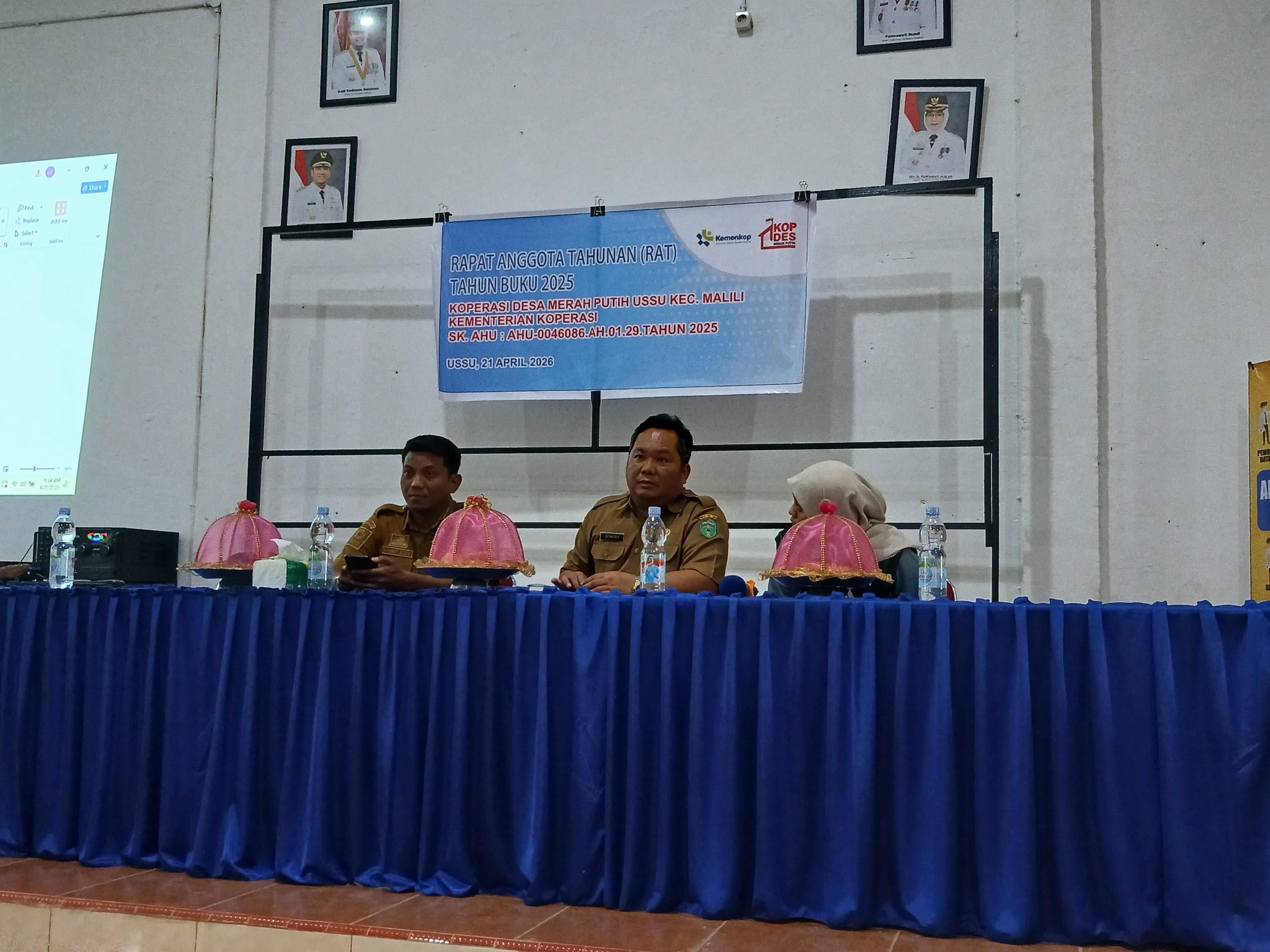 LUTIM, RRN – Kepala Dinas Perdagangan, Koperasi, UKM dan Perindustrian Kabupaten Luwu Timur,Senfry Oktavianus, S.STP, menghadiri Rapat Anggota Tahunan (RAT) Tahun Buku 2025 Koperasi Desa Merah Putih Ussu yang digelar di Aula Kantor Desa Ussu, Kecamatan Malili, Kabupaten Lutim, Selasa (21/4/26).