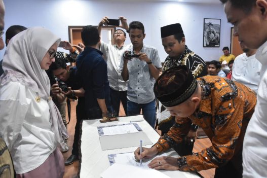 LUTRA, RRN — Bupati Luwu Utara, Ketua KPU Luwu Utara dan Ketua Bawaslu Luwu Utara melakukan penandatanganan Naskah Perjanjian Hibah Daerah (NPHD) untuk Pilkada Luwu Utara 2020 di Ruang Command Center Kantor Bupati, Jumat (27/9/2019). Penandatanganan ini disaksikan Ketua Bawaslu Provinsi Sulawesi Selatan La Ode Arumahi, Ketua DPRD Luwu Utara Hamuddin, Komisioner KPU, Anggota Bawaslu serta para Kepala Perangkat Daerah.