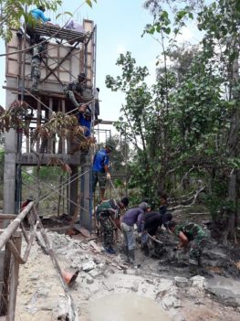 Anggota Satgas TMMD bersama warga melakukan pengecoran bak air yang menjadi tempat penampungan sebelum dialirkan kerumah-rumah warga.