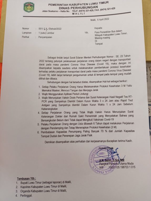 Selain itu, Kami juga akan menindak lanjuti Surat Edaran Menteri Perhubungan : SE.23 tahun 2022 tentang petunjuk pelaksanaan perjalanan orang dalam negeri dengan tranportasi darat pada masa pandemi Covid-19, harus mematuhi Protokol kesehatan 3M (Memakai Masker, Mencuci tangan,menjaga jarak), dan juga wajib menunjukkan Vaksin Dosis dan Surat keterangan Hasil negatif Tes RT-PCR yang sampelnya diambil dalam kurun waktu 3X24 jam atau Rapid Test Antigen yang sampelnya diambil dalam kurun waktu 1X24 jam sebelum keberangkatan.”Tutup Kadis Perhubungan”.