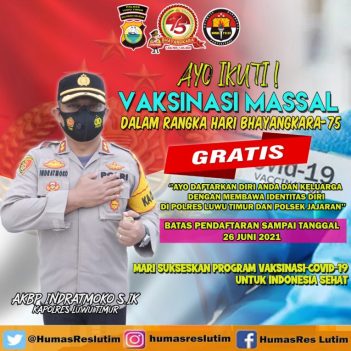 LUTIM, RRN—Guna mendukung program pemerintah, polres Luwu timur mengajak lapisan masyarakat untuk ikut mensukseskan program vaksinasi massal serta dalam rangka menyambut hari Bhayangkara ke-75.