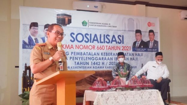 LUTIM, RRN – Dalam rangka pelaksanaan kegiatan pemberangkatan jemaah Haji dan Umrah, Kementerian Agama Kab. Luwu Timur menggelar Sosialisasi tentang Pembatalan Keberangkatan Haji pada penyelengaraan ibadah Haji Tahun 1442 H/2021 M di Aula Hotel I Lagaligo Malili, Selasa (5/10/21).
