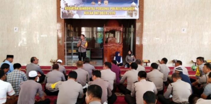 PANGKEP, RRN—Kepolisian Resor pangkep melaksanakan pembinaan rohani dan mental (Binrohtal) terhadap anggotanya yang beragama Islam yang dilaksanakan di mesjid Al Ikhlas Polres pangkep selesai melaksanakan apel pagi, Kamis (10/10/2019).