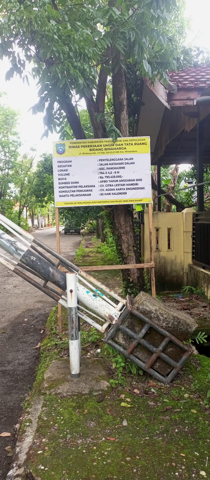 Berdasarkan papan proyek yang terpasang jauh dari lokasi pekerjaan, tercantum CV. Citra Lestari Mandiri sebagai kontraktor pelaksana dan CV. Agsha Karya Engineering sebagai konsultan pengawas.